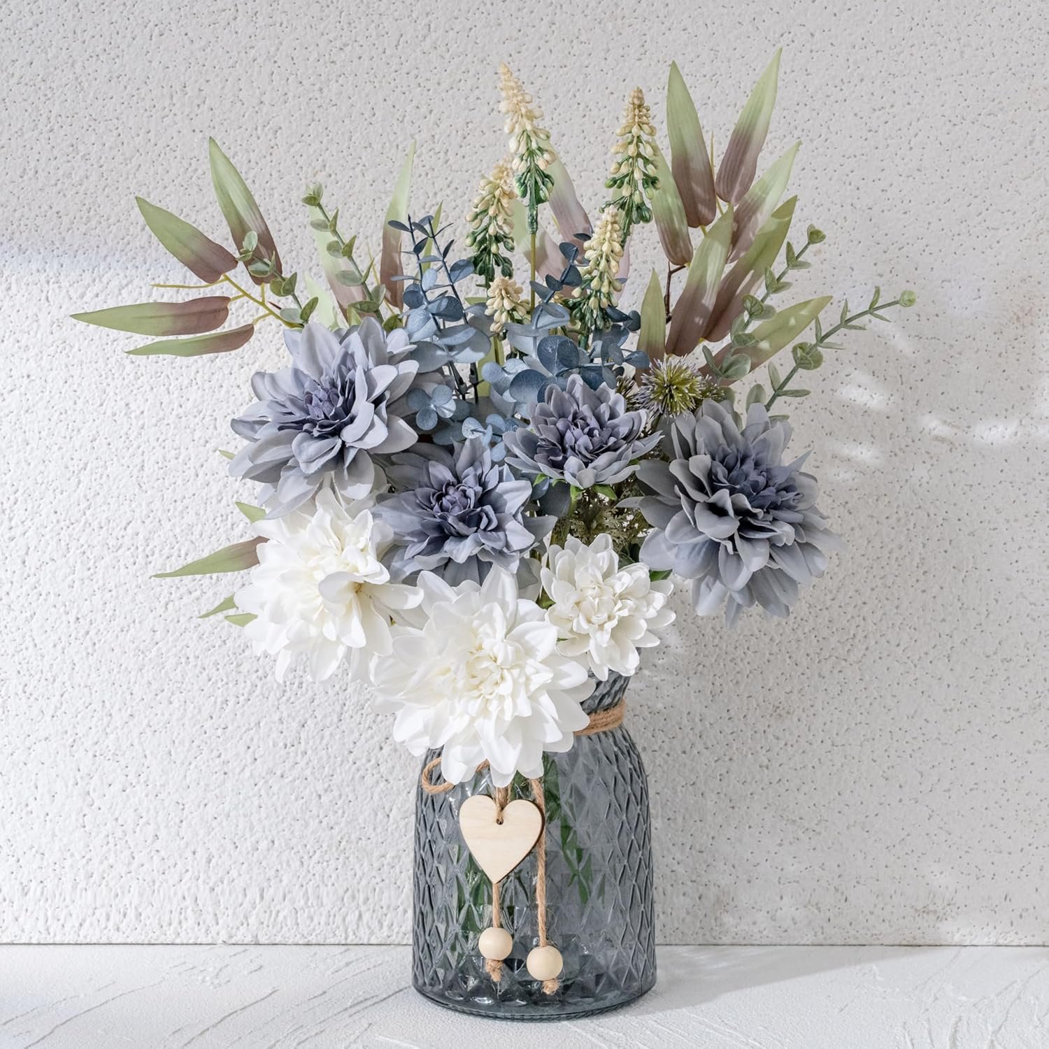 • Realistic & Elegant: This arrangement features a bouquet of blue artificial flowers and eucalyptus, presented in a glass vase adorned with twine. The mix of vibrant flowers and faux plants adds a unique touch to your decor. The coordinated colors with the glass vase create a natural yet distinctive look, bringing elegance and charm to any space.