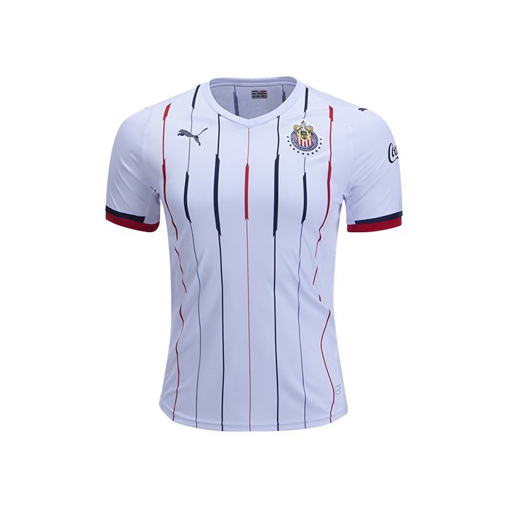 PUMA Chivas 18/19 Away Replica Jersey: Iconic white with gradient red/navy vertical pinstripes (expand at chest), modern V-neck, navy/red cuffs. Features raised retro club crest, internal “Haz Patria Rojiblanca” neck stamp (Mexican flag hues). Crafted with PUMA DryCELL 100% polyester—moisture-wicking, breathable for pro/leisure wear. Fits men’s sizes S–3XL; ideal for Liga MX, Copa MX, CONCACAF Champions League & casual streetwear.